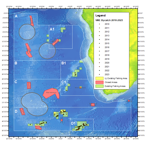 SEAFO scientific observers are required to record all locations where VME indicator species are caught. To date, no vessel has encountered by-catch above the thresholds.